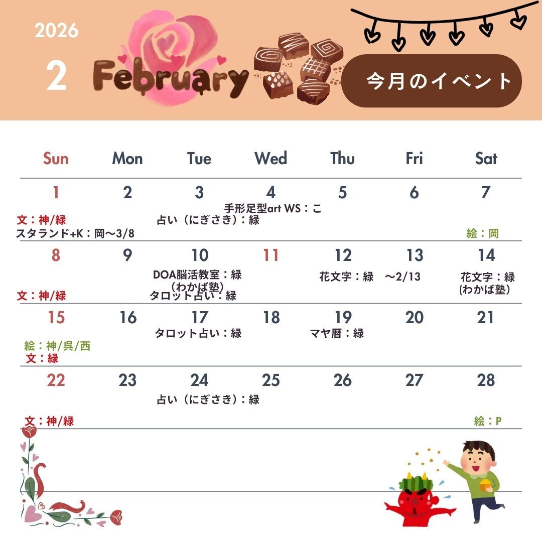 | 開催日 | ☆緑町 2/3・24 占い(にぎさき) 13:00~18:00頃 2/10 DOA脳活教室(わかば塾) 9:30-11:00 2/12-13 花文字 10:00~12:00、14:00~16:00頃 2/14 花文字(わかば塾) 10:00~12:00頃 2/10.17 タロット占い 13:00~18:00 2/19 マヤ暦 14:00~18:00 ☆こどもっちパークふくやま店 2/4 手形足型art WS 13:30~18:00 時間等は変更になる場合があります。 SNSでの告知や店舗へご確認をよろしくお願いいたします。 |
