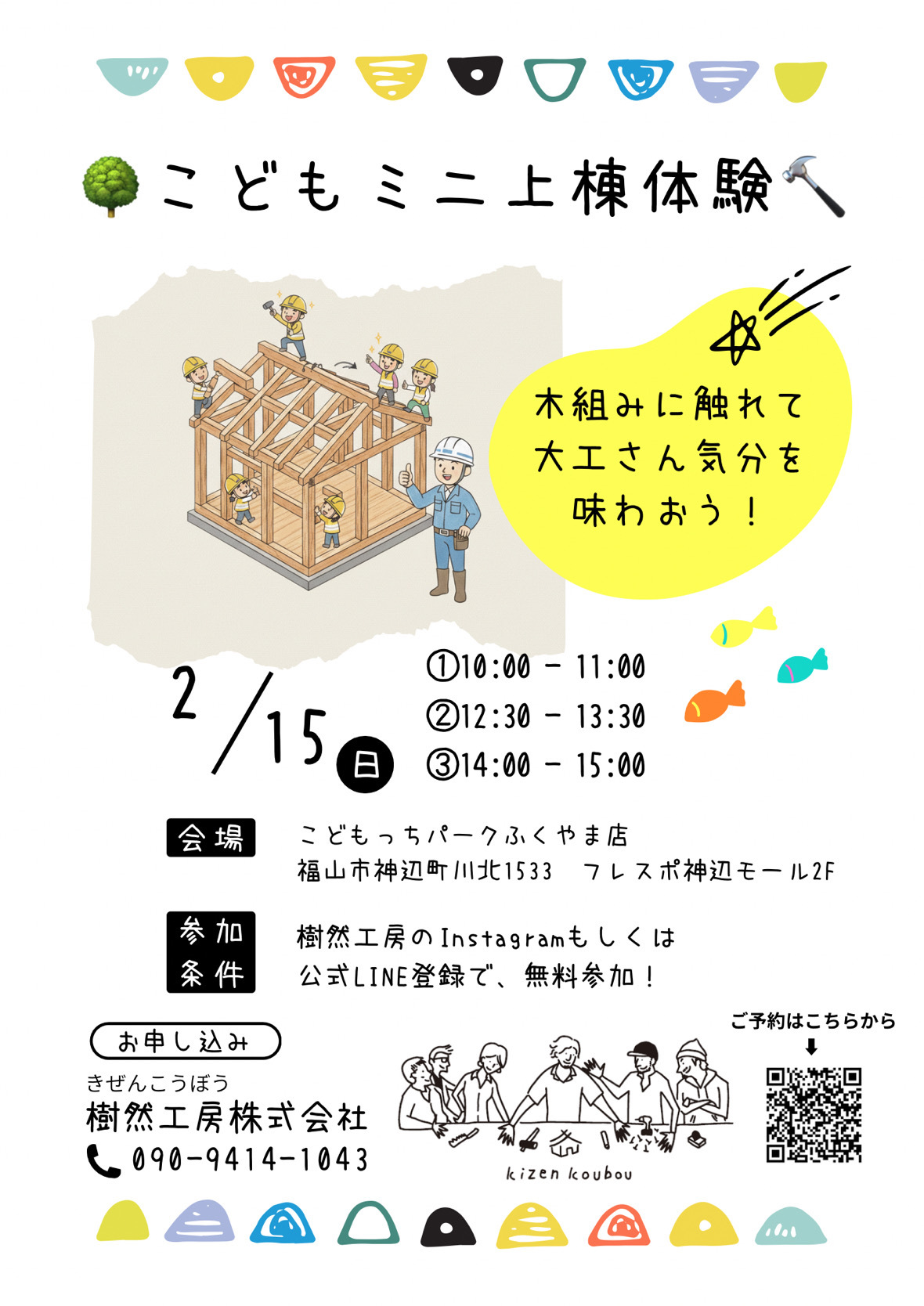| 開催日 | 2026年2月15日(日) ①10:00-11:00 ②12:30-13:30 ③14:00-15:00 樹然工房のInstagramもしくは公式LINE登録で無料参加! ※別途パーク入場料はかかります ~申込み~ 樹然工房株式会社 ✆090-9414-1043 |
