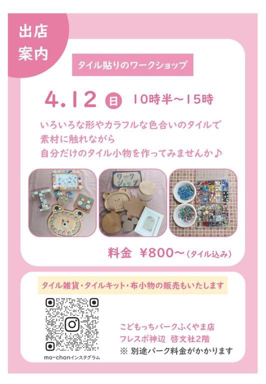 いろいろな形やカラフルな色合いのタイルで素材に触れながら 自分だけのタイル小物をつくってみませんか♪ タイル雑貨・タイルキッド・布小物の販売もいたします!!! |