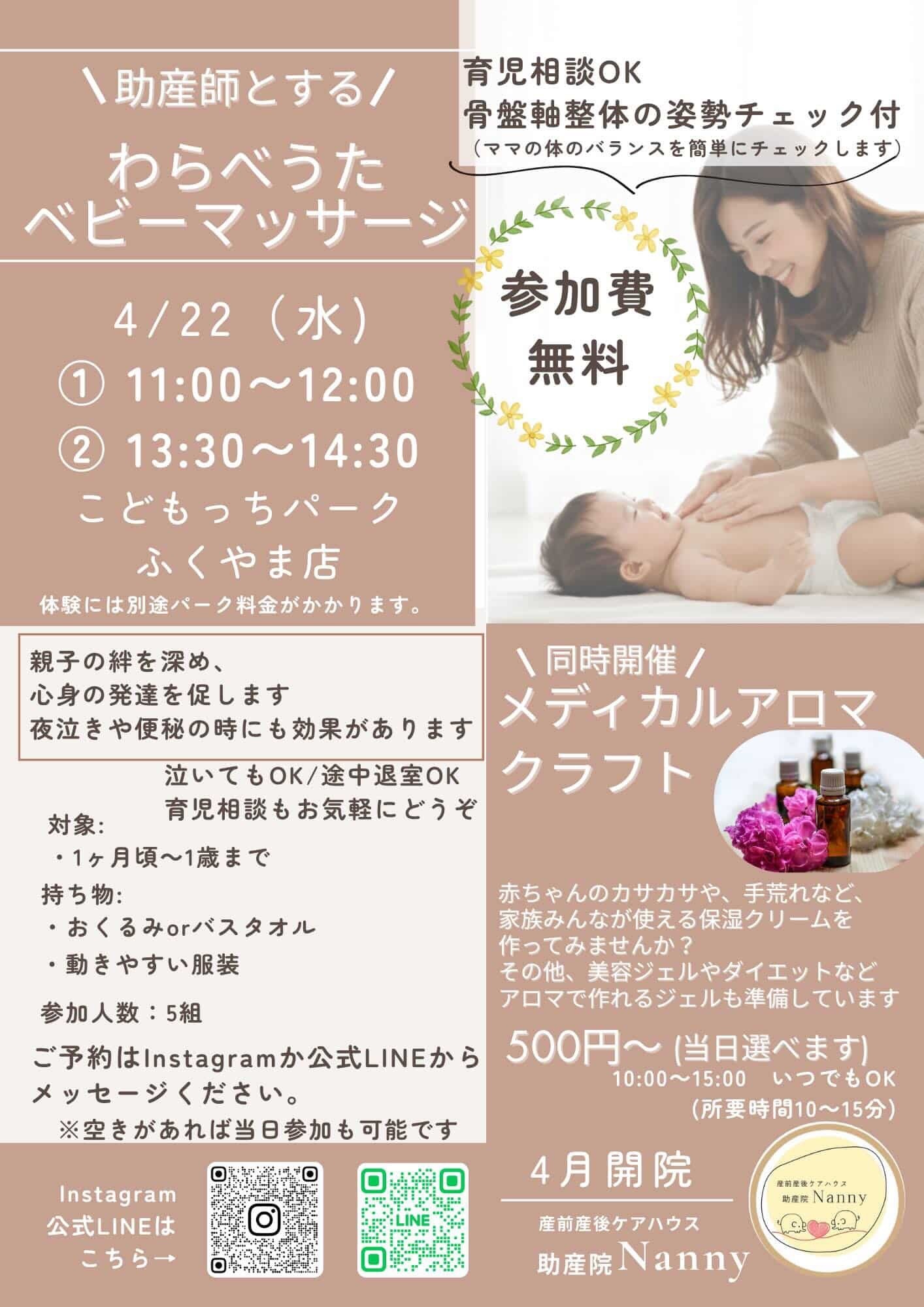 親子の絆を深め、 心身の発達を促します!!! 夜泣きや便秘の時にも効果があります! 泣いてもOK/途中退出OK 育児相談もお気軽にどうぞ! 対象:生後1ヵ月~1歳まで 持ち物:おくるみorバスタオル ※動きやすい服装でお越しください 参加人数:5組 同時にメディカルアロマクラフトも実施! 赤ちゃんのカサカサや、手荒れなど家族みんなが使える保湿クリームを作ってみませんか? 他、美容ジェルやダイエットなどアロマで作れるジェルモ準備しています! 500円~(当日選べます) ※10:00~15:00何時でもOK!(所要時間10分~15分) 予約はInstagramか公式LINEからメッセージをお願いします ※空きがあれば、当日参加もOK! |