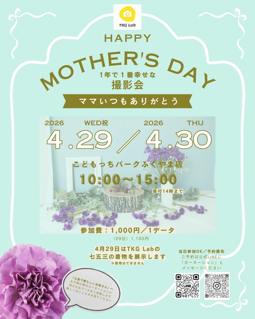 「上品で誇らしいお母さん」へ お子様が紫のカーナーションに包まれるブースをご用意します! 詳しくはインスタを見てください!! 参加費:1000円/1データ(29日は1100円) 当日参加OK/予約優先 ご予約は公式LINEに「カーネーション」とメッセージを! ☆4月29日はTKG Labの七五三の着物を展示します☆ ※着用は出来ません |