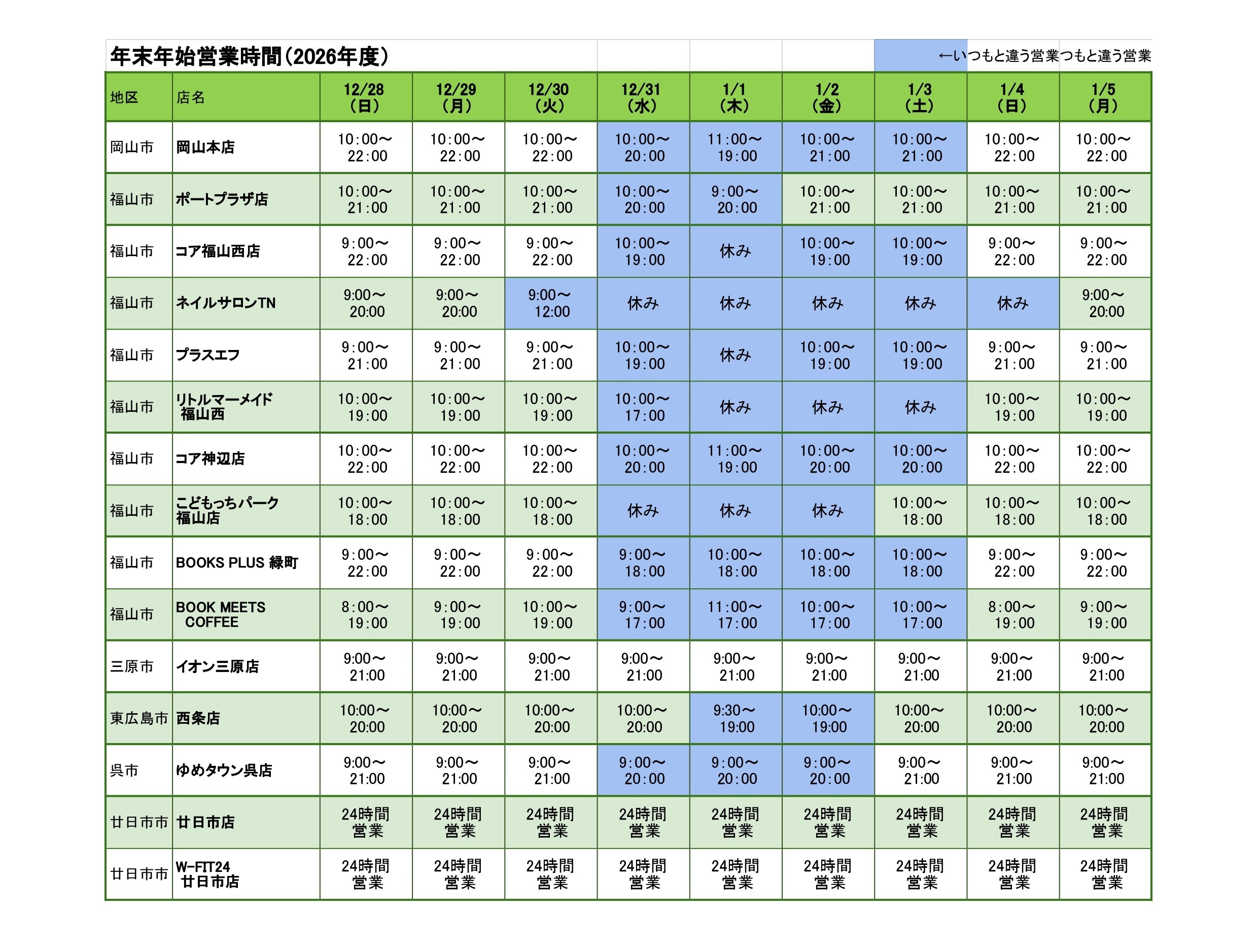 お知らせNEWS&EVENT 戻る 2025/12/04 更新 啓文社本社 ニュース 年末年始の営業時間のお知らせ 日頃より啓文社をご愛顧いただき誠にありがとうございます。誠に勝手ながら、店舗では年末年始期間において、営業時間を変更する店舗がございます。営業日時は、店舗によって異なりますので、下記よりご確認いただきますようお願い申し上げます。お客様には大変ご不便をおかけいたしますが、何卒ご理解くださいますようお願いいたします。 年末年始営業時間 もどる ホーム お知らせ一覧 年末年始の営業時間のお知らせ