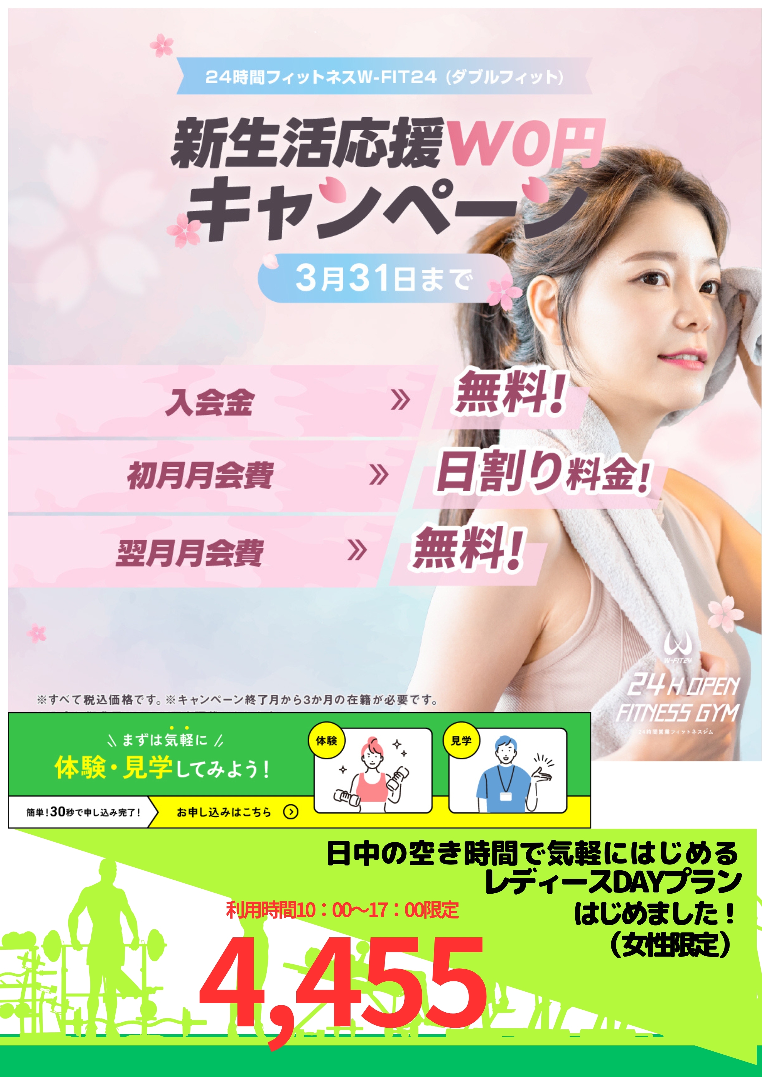 W-FIT24廿日市店では、3月限定のお得な入会キャンペーンを実施中です!